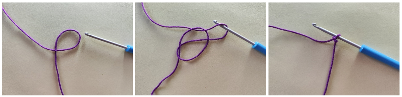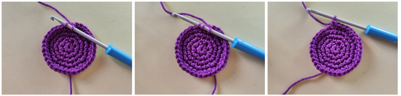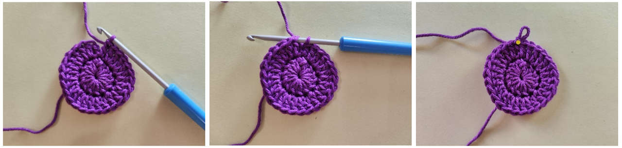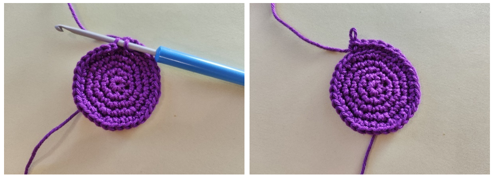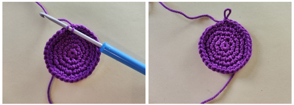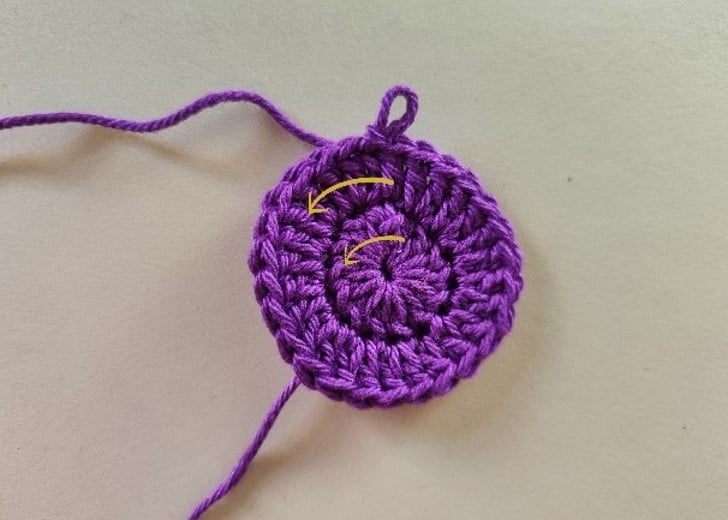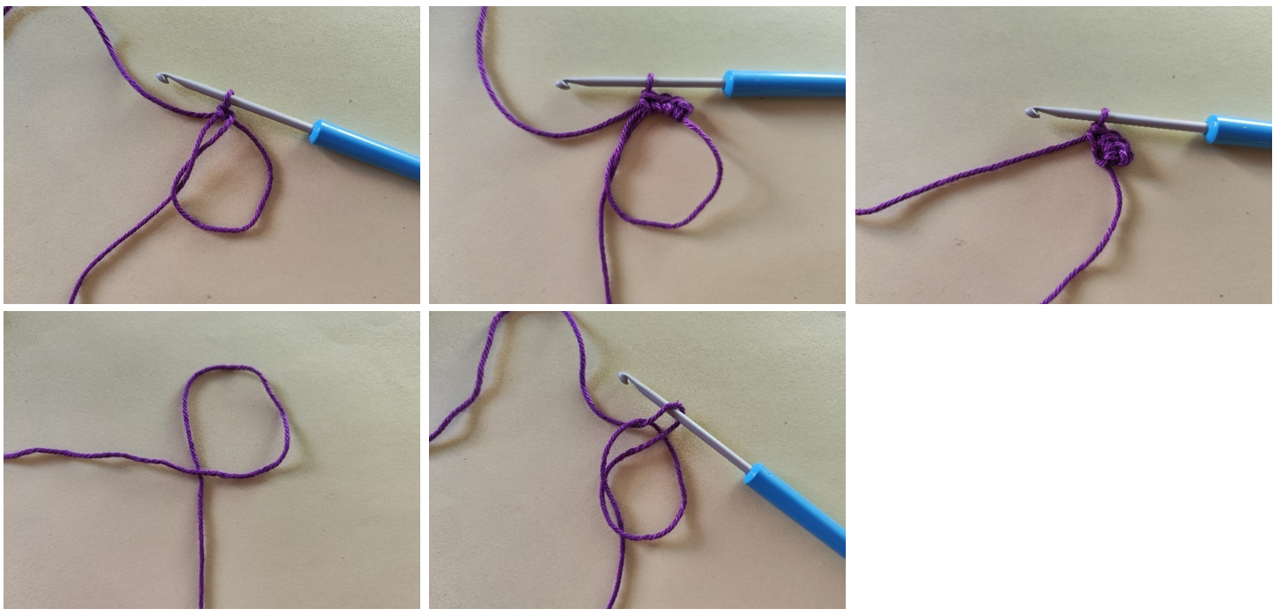 Както при началната бримка, създай бримка, през която издърпаш преждата от гранчето с пръсти. Идеята е, че краят на преждата трябва да е в долната част на бримката, не дърпаш бримката, т.е. пръстена, директно, а плетеш постовете през примката и крайната прежда едновременно. Когато необходимият брой бримки е готов, внимателно издърпай края на преждата, за да затвориш пръстена.
