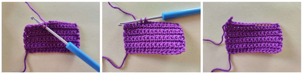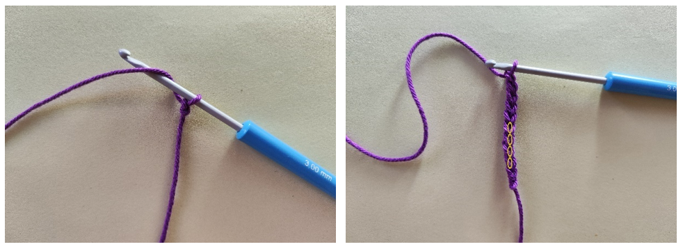 Направи бримка в края на преждата, издърпай преждата през нея с пръсти в посока навън от гранчето и вмъкни куката в нея, дръж бримката с пръсти и изплети една верижна бримка. След това изплети необходимия брой и тип постове. След като ги обработиш, внимателно издърпай края на преждата към гърба.