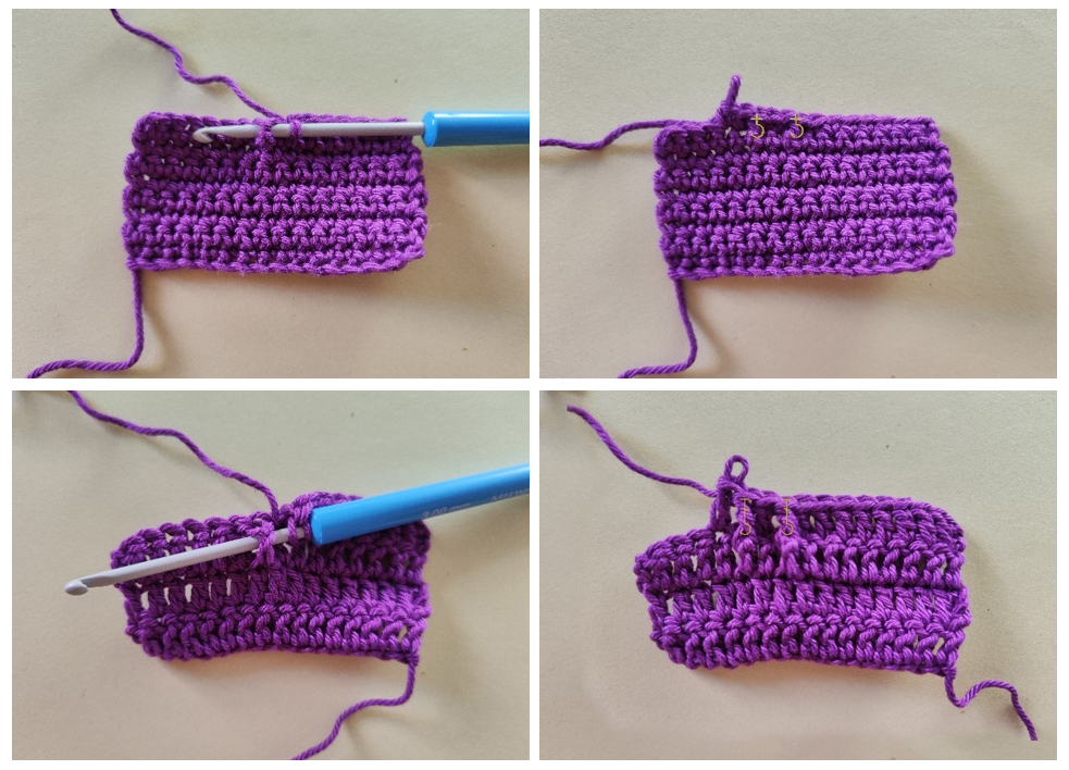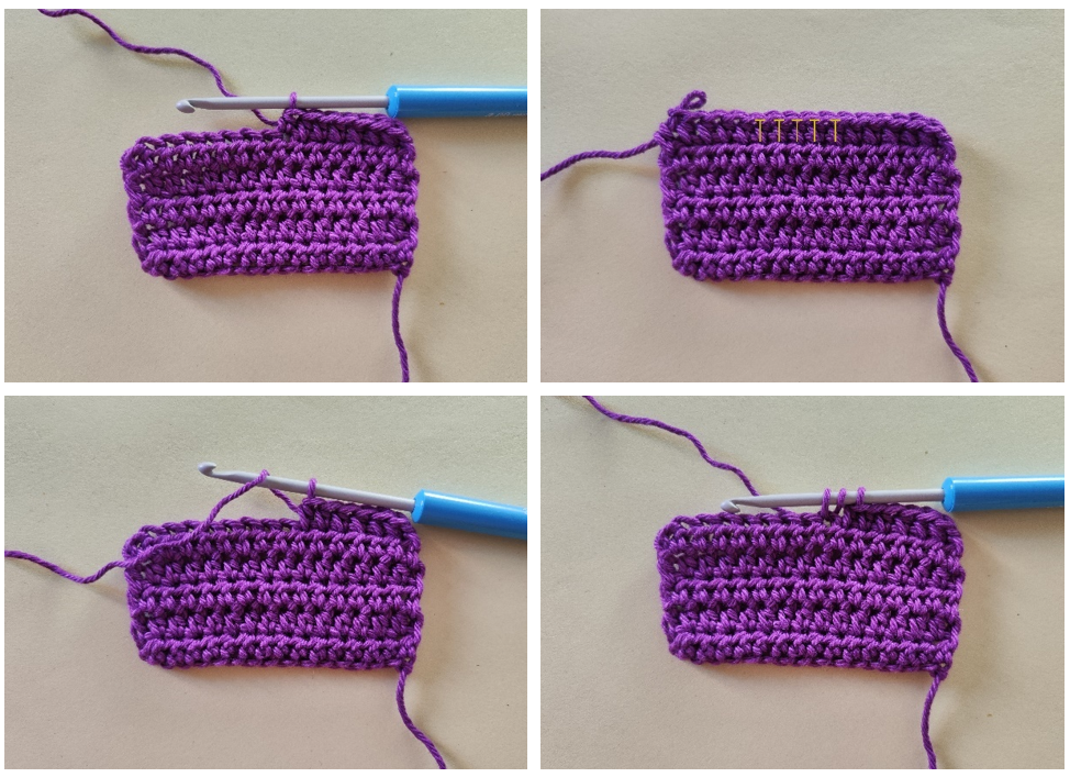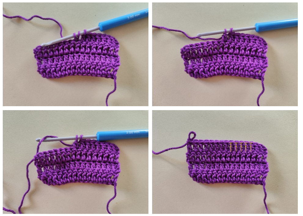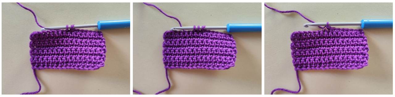 За нормален нисък пълнеж вмъкни куката в бримката, наддай, издърпайте преждата от бримката, не завършвайте поста, вмъкни куката в следващата бримка, наддай, издърпайте преждата от бримката, имаш три бримки на куката, наддай преждата и я издърпай през всички три бримки на куката.