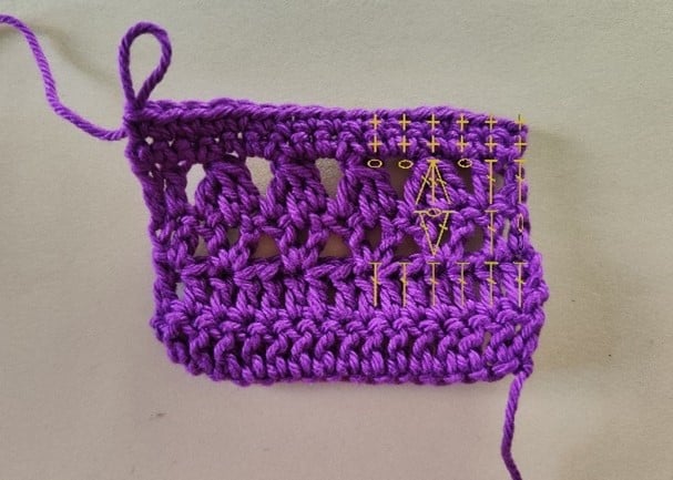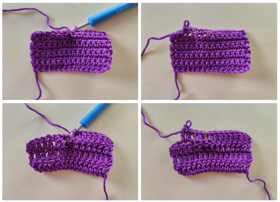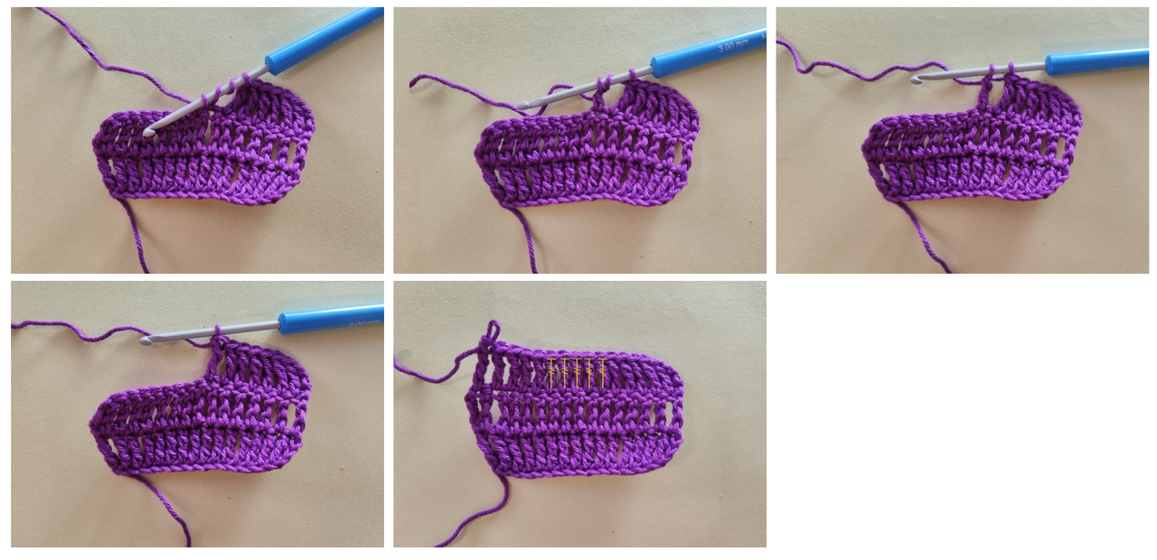 За висок пълнеж наддай, вмъкни преждата в бримката, наддай, издърпай преждата от бримката, наддай, издърпай през първите две бримки на куката и не завършвай поста, наддай, вмъкни куката в следващата бримка, наддай, издърпайте преждата от бримката, наддай, издърпай я през първите две бримки на куката, на куката имаш три примки, наддай и издърпай през трите примки на куката.
